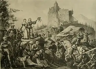 1518: Die Ramsteiner (links) verlassen die Burg, die Basler ziehen ein. Darstellung von Karl Jauslin