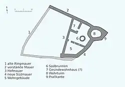- Die älteste Burg bestand aus wenigen an der Ringmauer angelehnten Steingebäuden. Eine zeitliche Zuordnung ist ungewiss.