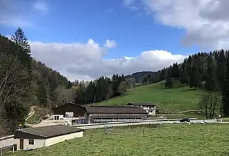 ![]() Häuser von Le Pichoux, links Bachgraben des Ruisseau de Tchaibez | ||