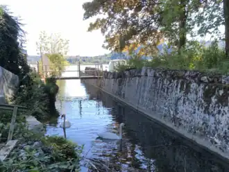 Der Bach wird in der Ebene heute von sieben Brücken und Stegen überspannt. Die alte Vaux-Brücke an der Route de Bâle (deutsch «Baselstrasse»), die vom Mittelalter bis zum Ende des Ancien Regime die damalige Landesgrenze zwischen dem Fürstentum Neuenburg und der Kastlanei La Neuveville im Fürstbistum Basel markiert hatte, ist mit ihrem gemauerten Brückenbogen erhalten, dessen Bauzeit nicht bekannt ist. Im 19. Jahrhundert kamen die neuen Brücken der modernen, von Neuenburg und Bern 1839 errichteten Landstrasse – heute die Hauptstrasse 5 – und der Bahnstrecke Lausanne–Biel/Bienne dazu und in der zweiten Hälfte des 20. Jahrhunderts direkt neben der Bahnlinie das Trassee der Nationalstrasse 5. Der untere Bachlauf liegt im letzten Abschnitt in einem gemauerten Kanal und ist zudem bei verschiedenen Gewerbebetrieben eingedolt. Neben dem Campingplatz[13] und dem Strandbad von La Neuveville mündet der Ruisseau de Vaux in den Bielersee.
