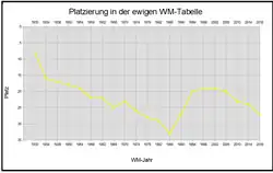 | 21 WM-Spiele 8 Siege 5[1] Unentschieden 8 Niederlagen 30:32 Tore | |