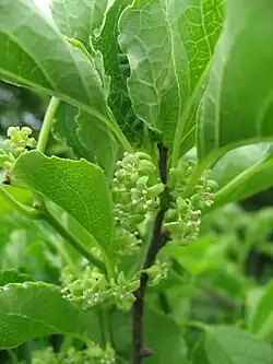 Die grünlichen Blüten sind meist zweihäusig diözisch verteilt und wachsen einzeln oder bis zu sieben in kurzen, 1 bis 3 Zentimeter langen, zymösen Blütenständen meist in den Blattachseln oder seltener an Zweigenden. Die funktionell eingeschlechtlichen, fünfzähligen Blüten mit doppelter Blütenhülle sind kurz gestielt. Es können zwittrige Blüten vorkommen. Männliche Blüten haben stumpf dreieckige Kelchblätter, die Kronblätter sind 3 bis 4 Millimeter lang, 2 bis 2,5 Millimeter breit, verkehrt-eiförmig bis elliptisch oder länglich. Der Diskus ist flach napfförmig, die Lappen sind flach mit stumpfem Ende. Die kurzen Staubblätter sind 2 bis 3 Millimeter lang, auch ist ein Pistillode vorhanden. Die Blütenkrone weiblicher Blüten ist kürzer als die der männlichen. Der Diskus ist fleischig. Die Staminodien sind sehr kurz. Der oberständige und dreikammerige Fruchtknoten ist beinahe kugelförmig, der kurze Griffel ist etwa 2 Millimeter lang, die Narbe ist deutlich dreifach gelappt, die Lappen sind leicht zweilappig.