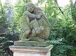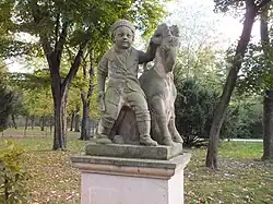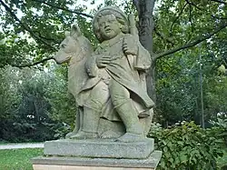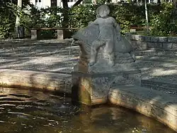 Der kleine runde Brunnenplatz wird mit Büschen und davor aufgestellten Bänken markiert. Zwischen den Buschgruppen befinden sich weitere Kinderskulpturen. Die Einzel-Kunstwerke zeigen einen Jungen mit einem Ziegenbock, einen Jungen mit einem Pelikan, einen Jungen in Jagdkleidung mit Gewehr und einem großen Hund sowie ein Mädchen mit einem gut genährten Truthahn.