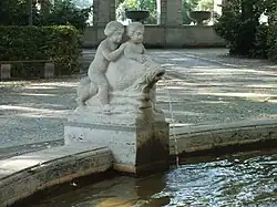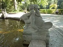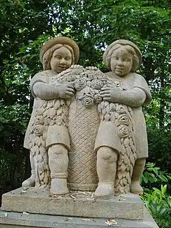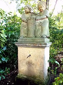 Am Zuweg vom Märchenbrunnen her steht je ein Mädchenpaar mit einem Korb auf einem Postament. In einem Korb sind Rosen zu sehen, die Gruppe symbolisiert wahrscheinlich das Märchen Schneeweißchen und Rosenrot, aus dem anderen Korb schauen Weintrauben und Weinblätter heraus. In den quaderförmigen Postamenten sind Wasserzuleitungen installiert, aus denen ein dünner Strahl in ein auf Bodenniveau eingearbeitetes längliches Steinbecken fließt. Alle Figuren einschließlich der Fische mit den Kinderpaaren wurden von Georg Wrba ausgeführt.