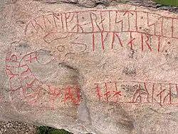 Der Text, der am Kopf der Schlange beginnt und im Uhrzeigersinn verläuft, lautet: „HrōðlæifR errichtete diesen Stein nach seinem Vater Skarf. Er war mit Ingvarr gefahren.“ Skarf ist ein Name, der nicht häufig auf Runensteinen anzutreffen ist. Er bezieht sich wahrscheinlich auf den Kormoran, auch Scharbe genannt.