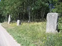 In der Nähe steht ein Bautastein. Die drei Steine stehen in situ an der Straße.