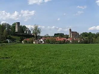 Auf der Anhöhe westlich des Dorfes erhebt sich das Schloss, das im 19. Jahrhundert an der Stelle des mittelalterlichen Herrschaftssitzes errichtet wurde. Vom einstigen Bau sind der mächtige runde Bergfried aus dem 12. Jahrhundert und ein Gebäude aus dem 16. Jahrhundert erhalten.