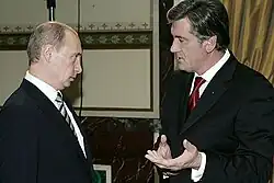 In den 1990er Jahren versuchte Präsident Leonid Kutschma eine ausgeglichene Außenpolitik zu verwirklichen. Er näherte die Ukraine an die NATO und die Europäische Union an, ohne die Beziehungen zu Russland zu vernachlässigen. Das Land litt allerdings unter einer wirtschaftlichen Krise und der sinkenden Industrieproduktion, welche durch den Verlust des einheitlichen Wirtschaftsraums verursacht wurde. Außerdem litt das Land an politischer Korruption und der Spaltung in einen prowestlichen Westen und einen prorussischen Osten, der in den meisten Wahlen andere politische Kandidaten unterstützte. Im März 1994 fand in der Autonomen Republik Krim ein Referendum statt, bei dem sich knapp 80 % der Wähler für eine stärkere Autonomie der Krim aussprachen.[21] Ähnliche Referenden fanden auch im Donbass statt.[22] Im Herbst 2004 kam es in der Ukraine zur Orangen Revolution der proeuropäischen Kräfte nach Unregelmäßigkeiten bei der Präsidentschaftswahl. Diese wurde von Russland unter dem 1999 ins Amt gekommenen Wladimir Putin mit Misstrauen betrachtet. Bei der wiederholten Präsidentschaftswahl gewann der prowestliche Wiktor Juschtschenko gegen den russlandfreundlichen Wiktor Janukowytsch. Juschtschenko war kurz vor seiner Wahl Opfer einer Dioxinvergiftung geworden, die er mit Spätfolgen überlebte. In einem späteren Interview antwortete Juschtschenko auf die Frage der BBC, ob der russische Präsident Putin involviert gewesen sei, er habe dazu eine Antwort, aber er werde sie nicht aussprechen.[23]