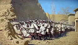 Die Eroberungen wurden von patriotischen literarischen und künstlerischen Werken begleitet, wovon auf russischer Seite die ausdrucksstarken Kriegs- und Schlachtengemälde des als „Russlands Kipling“ bezeichneten russischen Offiziers, Malers und Schriftstellers Nikolai Karasin (1842–1908), die von dem russischen Maler Franz Roubaud (1856–1928) und diejenigen des die Kriegsgeschehnisse der russischen Expansion teils kritischer beobachtenden[22] Wassili Wassiljewitsch Wereschtschagin (1842–1904) hervorragen. Michail Saltykow-Schtschedrin (1826–1889) behandelt das zentralasiatische Thema in seinem Werk Gospoda taschkentzy[23] (erste gekürzte Buchausgabe 1873, vollständig 1881; deutsch: Die Herren Taschkenter), einer Satire auf russische Bürokraten, die nach Taschkent geschickt wurden, um die dortige Bevölkerung zu 'zivilisieren'. Unmittelbar nach Karasin wird die orientalistische Wahrnehmung der Region beispielsweise in Nikolai Gumiljows berühmtem Gedicht Turkestanische Generäle (Туркестанские генералы,[24] 1912) deutlich – eine Art Ode an die tapferen Eroberer des wilden Ostens, Boten des erleuchteten Russlands.[25]