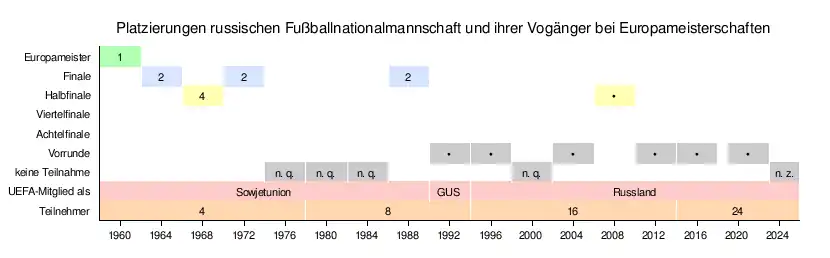 Der Artikel beinhaltet eine ausführliche Darstellung der russischen Fußballnationalmannschaft bei Europameisterschaften. Russland nahm als Teil der UdSSR bzw. der GUS an den Europameisterschaften 1960 bis 1992 teil. In der 1960er Europameistermannschaft stellten russische Spieler das größte Kontingent, während 1988 nur Rinat Dassajew, Wagis Chidijatullin und Sergei Dmitrijew russische Spieler waren und ukrainische Spieler, insbesondere von Dynamo Kiew den Großteil des Vizeeuropameisters stellten. Nach der Auflösung der Sowjetunion in mehrere selbständige Staaten nahm Russland erstmals an der Qualifikation zur EM 1996 teil und konnte sich auf Anhieb qualifizieren. Seitdem wurde lediglich die Qualifikation für die EM 2000 nicht geschafft, aber nur einmal die Vorrunde überstanden. Russland traf dabei bis einschließlich 2008 in der Vorrunde immer auf den späteren Europameister.