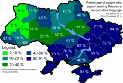 Die russische Sprache ist insbesondere im Süden und Osten des Landes verbreitet. Während die offizielle Volkszählung die Russischsprachigen nur in den Oblasten Luhansk und Donezk sowie auf der Krim in der Mehrheit sah, war dies unabhängigen Statistiken zufolge auch in weiteren Gebieten der Fall, speziell in den Oblasten Charkiw, Dnipropetrowsk, Odessa, Mykolajiw und Saporischschja.[3] Auch in Kiew war 2012 verschiedenen Statistiken zufolge die Mehrheit der Bevölkerung russischsprachig. Während die offizielle Volkszählung für Kiew nur rund 25 % russische Muttersprachler nannte, ergab die Statistik der Akademie der Wissenschaften, dass 41,2 % der Befragten sowohl Russisch als auch Ukrainisch im privaten Umfeld nutzen und 39,9 % sogar ausschließlich Russisch. Die Zahl derer, die dort nur Ukrainisch sprechen, lag nur bei rund 18 %.[2]