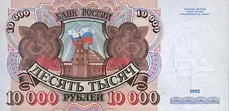 Die russische Zentralbank druckte 1992 neue Banknoten mit dem Motiv der russischen Flagge und der russischen Zentralbank anstelle einer Landesbezeichnung. Noch im selben Jahr begann die Privatisierung des Staatseigentums. Über 70 % der Geschäfte, Restaurants, Cafés und Werkstätten wurden an Privatpersonen verkauft; sie standen nun nicht mehr unter staatlicher Führung. Nach der Liberalisierung des Handels und der Freigabe der Preise begann eine Hyperinflation (1992 verzwanzigfachten sich die Preise durchschnittlich, die Inflationsrate betrug also rund 2000 %). In den Folgejahren betrug die Inflationsrate zwischen 100 % und 500 %.[3] Das Realeinkommen der Bevölkerung sank drastisch, einige Teile der Bevölkerung verarmten.[4]