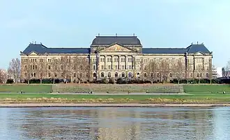 Das Gebäude wurde am Neustädter Elbufer zwischen Carolabrücke und Augustusbrücke von 1890 bis 1896 im Stil der Neorenaissance für das Königliche Ministerium der Finanzen erbaut.[3] Bauherr war König Albert von Sachsen. Vorher war das Finanzministerium im Fürstenbergschen Haus untergebracht. Der nach Entwürfen von Otto Wanckel und Ottomar Reichelt[3] errichtete repräsentative Neubau umfasst mehrere Innenhöfe. Die Elbfront trägt ein aus Majolikaplatten bestehendes Giebelbild des Malers Anton Dietrich, das Saxonia umgeben von den allegorisch dargestellten Künsten sowie den Einnahmen des Staates zeigt.
