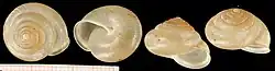 Das durchscheinende Gehäuse ist fast weißlich, hell gelblich bis hell hornbraun gefärbt. Die letzte Windung hat an der Peripherie ein etwas helleres Band unterschiedlicher Breite. Die Oberfläche glänzt stumpf und ist von einem feinen, regelmäßigen Muster, bestehend aus kleinen, länglichen und radial angeordneten, schuppenähnlichen Tuberkeln bedeckt, etwa 35 Stück pro Quadratmillimeter. Die Abstände entsprechen etwa der Länge der Tuberkel. Dieses Muster kreuzen sich mit sehr feinen Zuwachsstreifen.