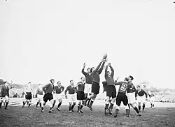 Der Erste Weltkrieg machte internationale Rugbytouren unmöglich. Mit der Australasientour 1921 begann die bis heute andauernde Rivalität zwischen den südafrikanischen Springboks und den All Blacks aus Neuseeland. Die beiden Teams galten mittlerweile als die besten der Welt, waren aber bisher noch nie gegeneinander angetreten.[37] Aus diesem Grund wurde die Tour der Springboks nach Australien und Neuseeland auch als „Rugby-Weltmeisterschaft“ bezeichnet.[38] Die aus drei Test Matches bestehende Serie endete ausgeglichen mit je einem Sieg, einem Unentschieden und einer Niederlage.[39] Der Gegenbesuch der All Blacks folgte 1928, auch diese Serie endete ausgeglichen.[40]