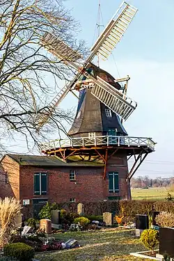 Windmühle: Der zweistöckige Galerieholländer mit Steert wurde 1907 durch Alfons und Jantjedine Goldenstein erbaut, die einer weit über Ostfriesland hinaus bekannten Müller- und Mühlenbauerfamilie entstammen. 1939 übernahm der Sohn Bernhard Goldenstein die Mühle. 1954 wurde sie an die Raiffeisen-Genossenschaft verkauft. Mittlerweile ist sie im Besitz der Gemeinde Uplengen. Die Mühle ist stillgelegt, kann jedoch auf Wunsch besichtigt werden.