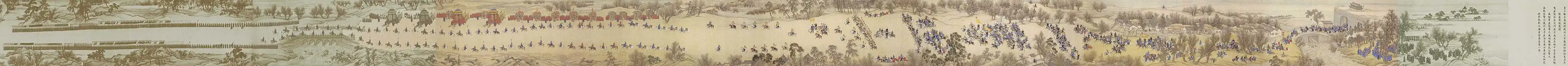 Von den aufgereihten elf Elefanten am Straßenrand haben die ersten vier traditionell die Funktion, die Straße frei zu räumen, die fünf folgenden tragen als ein Friedenssymbol goldene Vasen auf dem Rücken. Daneben sind vier große kaiserliche Kutschen aufgereiht. Der Anfang der Reiterkolonne überquert gerade die Liangshui-Brücke. Das Spalier der Paradetruppe endet vor dem Südlichen Jagdpark, wo sich der Kaiser als erste Station aufhalten wird. In der Realität betrug die gemalte Wegstrecke etwa sieben Kilometer.