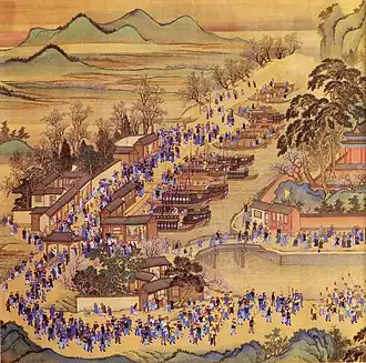 Dargestellt wird die Abreise des chinesischen Kaisers 康熙 Kangxi mit Gefolge aus Peking über das Yongding-Tor. Das Bild hat die Abmessungen von 67,8 mal 1555 cm. Es entstand anlässlich der erfolgreichen zweiten Inspektionsreise des Qing-Kaisers in die südlichen Provinzen Jiangsu und Zhejiang, die dieser unternahm, um die Wasserbauten des Gelben Flusses zum Schutz der Bevölkerung vor Überschwemmungen zu begutachten.