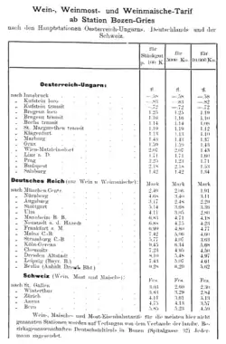 Die Einkellerung an Südtiroler Weinhöfen erlebte im endenden Mittelalter und in der Habsburgerzeit (ab 1363) eine Blütephase. Die Tiroler Landesfürsten schützten die heimischen Anbaugebiete und ihre Exportchancen nach Norden durch entsprechende Maßnahmen: Herzog Leopold III. von Habsburg erließ bereits 1372 auf Antrag der auf Weinwirtschaft ausgerichteten Bürgerschaft von Bozen ein Einfuhrverbot für italienische Weine nach Südtirol, die aus Gebieten südlich des Noce und des Avisio („welsche wein vnder des Eveys“) stammen.[5] Diese Abschottungspolitik wurde über Jahrhunderte aufrechterhalten.