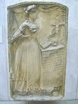 Elias Räntz schuf das Grabmal der Gerberstochter Margarete Katharina Schlenk aus dem Haus Kulmbacher Straße 6, die als „Stecknadelbraut“ in die Bayreuther Annalen einging. Die 19-jährige junge Frau verschluckte am Tag ihrer Hochzeit im Jahr 1721 beim Anlegen der Brautkleidung eine Stecknadel und starb. Bis 1998 stand der Grabstein als Gedenkstein unter freiem Himmel an der Friedhofsmauer. Da der Sandstein zunehmend verwitterte, erhielt er einen geschützten Platz in der Aussegnungshalle.[36]
