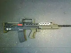 Bei den Waffen der SA80-Serie handelt es sich um Gasdrucklader mit Drehkopfverschluss,[2] die Munition vom Kaliber 5,56 × 45 mm NATO verschießen. Durch das Bullpup-Design ergibt sich eine sehr kompakte Waffe, die aber nicht von der linken Schulter aus abgefeuert werden kann, da sich das Auswurffenster auf der rechten Seite der Waffe in Höhe des Gesichts befindet, was zu Verletzungen führen kann.[3]