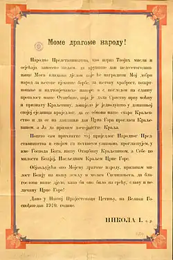 Das Ende des Krieges, das Montenegro eigentlich auf Seiten der Siegermächte fand, änderte daran nichts. Unter der Behauptung, dass Nikola einen Sonderfrieden mit dem Feind zu schließen gesucht habe, und mit Hilfe einer angeblich manipulierten „Nationalversammlung“ (eine Behauptung der Gegner des Staatenbundes Serbien-Montenegro; tatsächlich waren 90 % der Abgeordneten von anno 1914 versammelt, von denen etwa 70 % für die Vereinigung mit Serbien zu einem gemeinsamen südslawischen Staat gestimmt haben) wurde das Land mit Serbien vereinigt (29. November 1918) und daraufhin Teil des Königreiches der Serben, Kroaten und Slowenen (Erstes Jugoslawien). Nachdem königstreue Aufstandsversuche 1919 niedergeschlagen worden waren und Proteste der Exilregierung gegenüber der internationalen Staatengemeinschaft nicht fruchteten, starb König Nikolaus I. 1921 in Frankreich, die Exilregierung löste sich 1922 auf.
