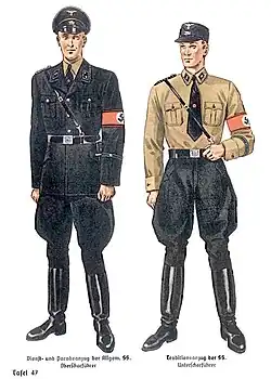 Dazu wurde das sogenannte „Lettow-Hemd“ (Braunhemd), nun als offizielles „Parteihemd der NSDAP“, mit schwarzem Binder getragen.[6] Am linken Oberarm wurde das „Kampfband der SS“ (Hakenkreuzarmbinde, verschiedentlich auch als „SS-Sturmbinde“ bezeichnet) und über dem linken Ärmelaufschlag das schwarze „Sturmband“ in mattweißer Umrandung getragen. Dazu kamen noch ein schwarzes Koppel mit Schulterriemen und schwarze „Stiefelhosen“ (Breeches- oder Reithosen) und Stiefel.