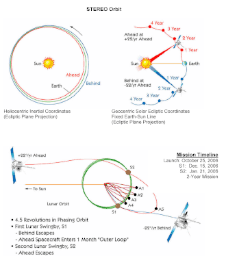 Während mehrerer Erdumläufe entfernen sich die Raumsonden voneinander. Am 15. Dezember 2006 führten STEREO A (Ahead) und B (Behind) ein Swing-by am Mond aus, wobei STEREO A den Mond in einer Entfernung von 7.322 km passierte und STEREO B in 11.750 km. STEREO A überschritt dadurch die Fluchtgeschwindigkeit des Erde-Mond-Systems und fliegt der Erde in ihrer Umlaufbahn um die Sonne voraus. STEREO A trat dabei in eine Sonnenumlaufbahn ein, die etwas innerhalb der Erdumlaufbahn liegt und deren Umlaufzeit 346 Tage beträgt. STEREO A umkreist dadurch die Sonne schneller als die Erde und läuft jedes Jahr gegenüber der Erde um 22° weiter auf ihrer Umlaufbahn nach vorne.