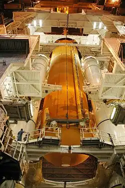 Damit waren die Arbeiten am Orbiter abgeschlossen und er wurde am 12. Mai in das VAB überführt. Dort wurde die Discovery mit dem Außentank sowie den beiden Feststoffraketen verbunden und auf die Startplattform gesetzt. Genau eine Woche später wurde die Fähre zur Startrampe gerollt.