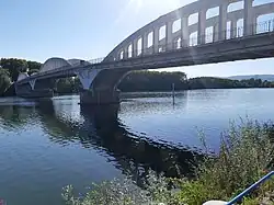 Im Zweiten Weltkrieg wurde der ostwärtige Brückenbogen von den sich zurückziehenden deutschen Truppen gesprengt. Beim Wiederaufbau gab es Schwierigkeiten mit der Materialbeschaffung. Daher wurde teilweise amerikanisches Moniereisen verbaut.[2]