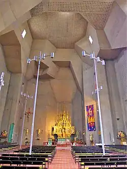 Der Bau als expressive Betonplastik, die Stadt mit ihrem Vaubanschen Festungsgrundriss und der Titelheilige der Kirche – der heilige Ludwig – gaben das Programm zur Interpretation der Heilsgeschichte, die ich dem verlorenen Geschichtsverständnis unserer Tage entgegensetzen wollte: Macht und Ohnmacht, Königtum und Knechtschaft, Ruhm und Passion, Leben und Tod.“