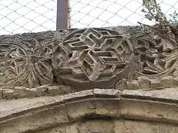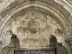 Oberhalb seiner Spitze befindet sich im äußeren Rahmen ein knapp 1,5 m breites und 45 cm hohes Relief. Die Mitte des Reliefs bildet eine große Rosette direkt über der Spitzbogen-Spitze. Links und rechts von ihr befinden sich drei kleinere Rosetten.