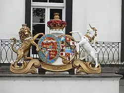 - Feld 2: In Rot eine goldene Lilienhaspel mit acht Lilien, belegt mit einem weißen Herzschild. (Herzogtum Kleve, Erbanspruch)