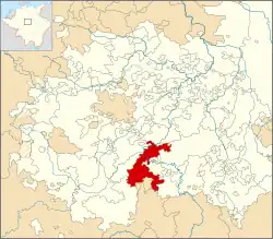 Blasonierung: Das Wappen ist fünfmal geteilt und zweimal gespalten mit Mittelschild auf dem fünften und achten Feld. In den Feldern: