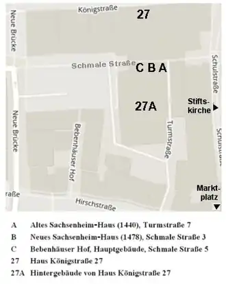 - ↑ Das Sachsenheim-Haus stand etwa dort, wo sich heute das Hintergebäude Königstraße 27A des ehemaligen Karstadt- und zukünftigen Primark-Kaufhauses (Stand: 2016) befindet, an der Stelle, wo sich die Verlängerungen der Schmalen Straße und der Turmstraße treffen würden.