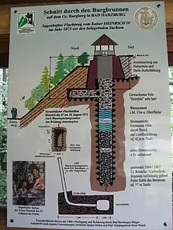 Laut dem Chronisten Lampert von Hersfeld zogen am 29. Juni 1073 die sächsischen Großen vor die Kaiserpfalz Goslar, um auf diese Missstände hinzuweisen und Besserung einzufordern. Heinrich IV. verweigerte den Dialog und floh vor den daraufhin mit einem großen Heer anrückenden Sachsen auf die nahe Harzburg, wo ihn die sächsischen Aufständischen unter der Führung von Otto von Northeim und Bischof Burchard von Halberstadt belagerten. In der Nacht auf den 10. August 1073 konnte Heinrich mitsamt den Reichsinsignien aus der belagerten Burg entkommen. Der Sage nach nutzte er dazu einen Geheimgang, der in 12 m Tiefe im Brunnen begann und unter den Burgmauern hindurch führte. Der Brunnen wurde 1968 freigelegt, wobei der Geheimgang gefunden wurde.