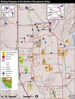 Der Verlust natürlicher Wasserflächen führte dazu, dass Millionen von Zugvögeln die bewässerten Reisfelder im nördlichen Sacramento Valley auf ihrem Weg von und zu ihren Brutgebieten nutzten und den Reisbauern auf diese Weise große Verluste bescherten.[5] Als die Zusammenhänge der Vogelmigration auf Massenzugwegen wie dem Pacific Flyway in der ersten Hälfte des 20. Jahrhunderts allmählich besser verstanden wurden, beauftragte der U.S. Fish & Wildlife Service das Civilian Conservation Corps mit der Schaffung von Schutzgebieten, zu denen auch das 1937 eingerichtete Sacramento National Wildlife Refuge gehörte. Bis ins Jahr 1989 wurden mit dem Delevan, Colusa, Sutter und dem Sacramento River National Wildlife Refuge vier weitere Schutzgebiete eingerichtet, die den Zugvögeln Überwinterungsmöglichkeiten bieten und gleichzeitig landwirtschaftliche Schäden verhindern sollten.[6] Zwischen den Jahren 1979 und 1991 kamen noch drei Wildlife Management Areas zum Zweck der Bereitstellung von Feuchtgebieten sowohl für Zugvögel als auch für andere auf diesen Lebensraum angewiesene Arten hinzu.[6]
