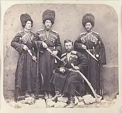 Bis zum Ende des Kaukasuskrieges 1864 siedelten die Abasinen-Stämme – damals in Literatur oft „Abasa“ genannt – nicht in ihrem heutigen Gebiet, sondern in einem südlicheren, wesentlich größeren Siedlungsgebiet höher im Gebirge. Durch den Zuzug der Stämme des Aschkar-Dialektes im 18./19. Jahrhundert expandierte ihr Siedlungsgebiet in dieser Zeit allmählich, besonders nach Nordosten hin.[3] Die Abasinen teilten das Schicksal der westlichen Tscherkessen in den russischen Deportationen am Ende des Kaukasuskrieges um 1864. Die letzte Schlacht dieses Krieges war die Niederlage der Achtschipsou-Sads-Abchasen in der Schlacht von Kbaade am 21. Maijul. / 2. Juni 1864greg. dessen Datum tscherkessische und abchasisch-abasinische Verbände bis heute gedenken. Über 80 % wurden ins damalige Osmanische Reich als Muhadschire (Flüchtlinge) ausgesiedelt, ca. 10 % in flachere Gebiete am mittleren und unteren Kuban umgesiedelt. Etwa 10 % kamen um, teilweise sogar von russischen Verantwortlichen hingenommen oder befürwortet, weshalb die Deportation heute auch oft als Völkermord gesehen wird. Dadurch leben sie heute in einem nördlicheren und wesentlich kleineren Siedlungsgebiet. Unter Abchasen flüchteten nach Schätzungen bis zu 70 %, oder wurden deportiert, darunter alle Angehörigen der unabhängigen sads-abchasischen Stammesverbände.