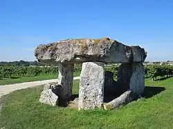- Der megalithzeitliche Dolmen de la Pierre Levée steht südöstlich des Ortes inmitten der Weinhügel; er wird um 3500 v. Chr. datiert. Nur drei der ehemals sechs oder sieben Tragsteine (Orthostaten) tragen das Gewicht der etwa 7,2 Meter langen und etwa 4,7 Meter breiten Deckenplatte, die in einer lichten Höhe von etwa 2,2 Metern über dem Bau zu schweben scheint. Während die Deckplatte weitgehend unbehauen ist, sind die Tragsteine geglättet und rechteckig behauen, so dass sie beinahe lückenlos nebeneinander gesetzt werden konnten. Die verbleibenden Lücken zwischen und oberhalb der Orthostaten waren mit Bruchsteinen ausgefüllt; möglicherweise war der gesamte Bau von einem Grabhügel bedeckt, der im Lauf der Zeit abgetragen wurde. Der Dolmen ist seit dem Jahr 1983 in die Liste der Monuments historiques eingetragen.[1][2]