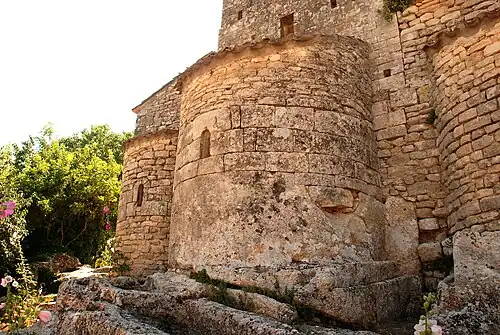 - Am Ortsrand steht die direkt auf den Fels gebaute und als Monument historique qualifizierte mittelalterliche Kirche Saint-Pantaléon[1]. Die kleinen Fensteröffnungen der drei Apsiden sind mit modernen farbstarken Bleiglasfenstern versehen.