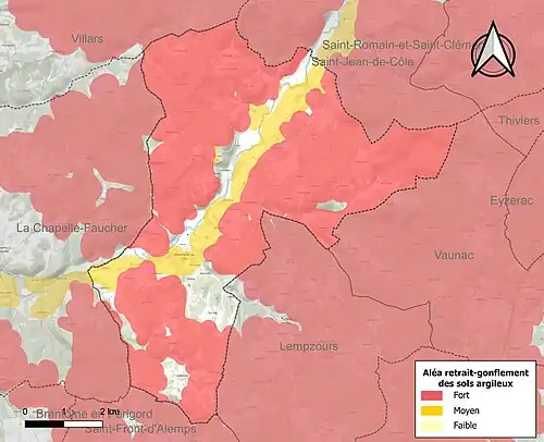 Wie die Risikokarte zeigt, ist La Chapelle-Faucher von der Gefahr durch Bodensetzungen betroffen, die Gefahren konzentrieren sich hierbei mit großer Stärke (in Rot) auf Böden des Kolluviums beiderseits der Côle, mit mittlerer Stärke (in Gelb) auch auf die Alluvialböden im Tal der Côle.