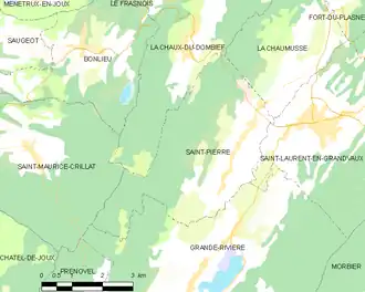 Nachbargemeinden von Saint-Pierre sind La Chaux-du-Dombief und La Chaumusse im Norden, Saint-Laurent-en-Grandvaux im Osten, Grande-Rivière Château im Süden sowie Saint-Maurice-Crillat im Westen.