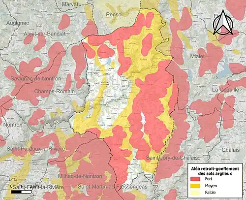 Wie die Risikokarte zeigt, ist Saint-Saud-Lacoussière zu 77,7 % seines Gemeindegebietes mittelmäßig bis relativ stark von der Gefahr durch Bodensetzungen betroffen. Ausgenommen hiervon ist der Saint-Mathieu-Leukogranit.