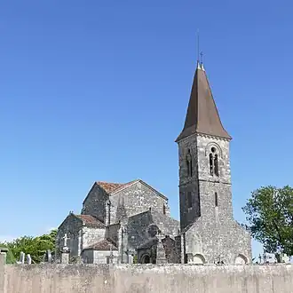 - Kirche Saint-Vincent von 1863 mit Glockenturm und Westfassade des Vorgängerbaus aus dem 12. Jahrhundert[3]
