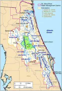 Linke Nebenflüsse Mills Creek River, Econlockhatchee River, Wekiva River, Black Water Creek (Lake County), Alexander Springs, Salt Springs Run, Ocklawaha River, Cross Florida Barge Canal, Rice Creek/Simms Creek, Black Creek, Ortega River, Trout River