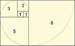Goldene Spirale und Kachelanordnung aus Quadraten, deren Kantenlängen der Fibonacci-Folge entsprechen