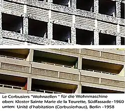 La Tourette ist neben dem kleineren und weniger komplexen Carpenter Center for the Visual Arts, das Corbusier nie gesehen hat,[69] in Harvard (Fertigstellung 1962) sein letztes, mit großer konzeptioneller Konsequenz zu seinen Lebzeiten, fertiggestelltes Projekt, wenn man von den beiden wenig bekannten Funktionsgebäuden der Schleuse Kembs-Niffer absieht (Fertigstellung 1962). Der Erfolg und die Bedeutung dieses Projektes sind nicht zuletzt dem Zusammenwirken zwischen Architekt und seinen Auftraggebern während der Planung[70], während des Baus[71] und nach der Vollendung zu verdanken.[72]