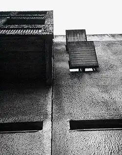 Im Klosterinnenhof bestehen die Fenster in den unteren Geschossen des Wohntraktes aus großen vom Boden bis zur Decke reichenden verglasten Betonrahmen.[43] Zur Belüftung der Gemeinschafts- und Seminarräume sind vertikale Luftschlitze mit drehbaren Metallfenstern ausgestattet. In den "Kreuzgängen" sind wiederum die rhythmisch gegliederten Fensterrahmen zu finden (siehe untere Skizze in:[44]), während vor den Mönchszellen die Korridore durch horizontale Schlitze belichtet werden, die den Ausblick auf den Innenhof freigeben.[45] An ihrem Ende versperren sog. "Betonblumen", die von außen eher Pferdeköpfen ähneln, den Blick in die Landschaft.