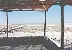 Der Salar de Atacama (span.[7] Salzstelle von Atacama) ist das größte aktive Evaporit-Becken im Bezirk Región de Antofagasta in Nord-Chile. Der Salar liegt in der Atacama-Wüste, in einer abflusslosen Senke am Fuß der Andenkordillere, umgeben von zahlreichen besiedelten Oasen. Er besteht aus einer harten, rauen, weißen Schicht Salz verunreinigt mit Wüstensand. Darunter befindet sich eine lithiumhaltige Sole. Zufließendes Wasser tritt in sporadisch auftretenden Tümpeln hervor, die wichtige Biotope bilden.[8]