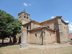 - Die portal- und schmucklose Westfassade der auf einem romanischen Vorgängerbau im 15. Jahrhundert neu errichteten spätgotischen Pfarrkirche (Iglesia de Santa Cecilia), deren Apsis- und Langhauswände durch – teilweise barock anmutende – Strebepfeiler stabilisiert sind, wird von einem Glockengiebel (espadaña) dominiert. Das Portal mit seinen profilierten Archivoltenbögen befindet sich – wie bei vielen Kirchen im Norden Spaniens üblich – auf der Südseite der Kirche.[8]